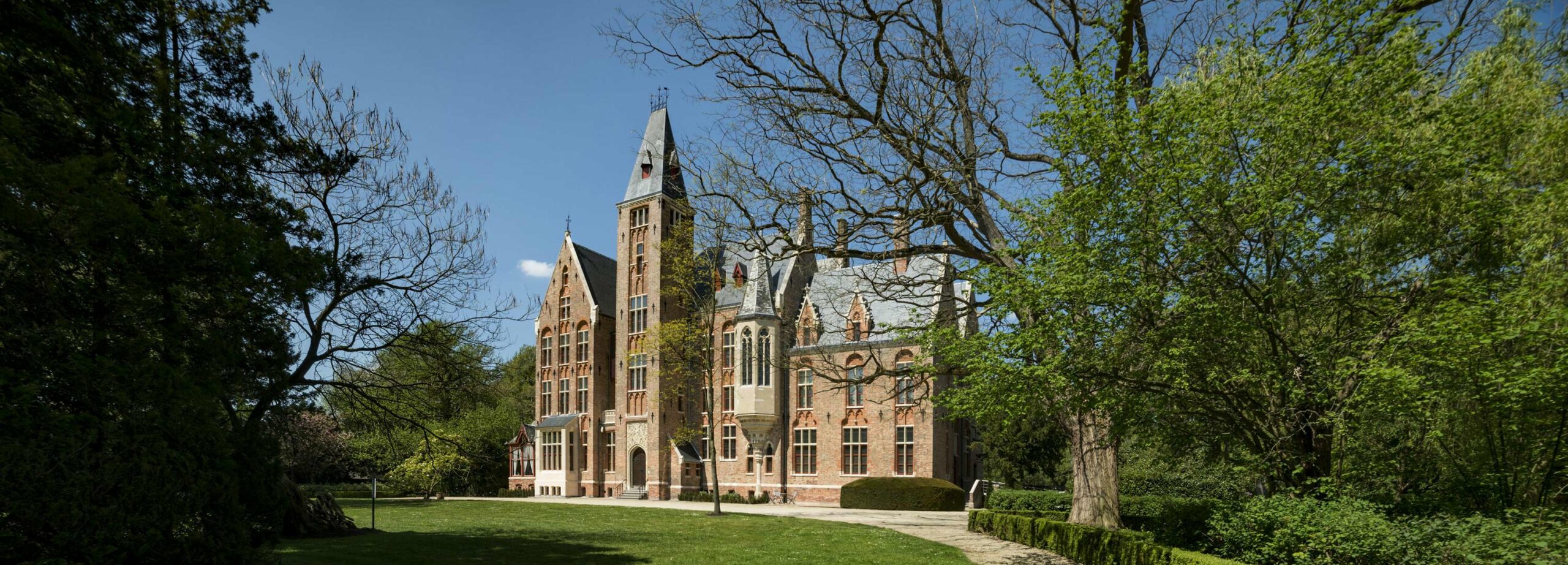A few kilometers from Bruges, close to the Oostende-Brussel motorway, stands Loppem Castle, an impressive House (kasteel/château) built between 1858 and 1863 in the, at that time, predominant Neo-Gothic style and surrounded by a romantic English garden with its maze of red and green hornbeam and several ponds and grottos.